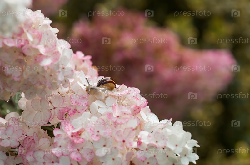 Наземные гастроподы моллюски семейства Helicidae. виноградная улитка (Helix pomatia) на цветущей гортензии. садовый вредитель. съедобная улитка