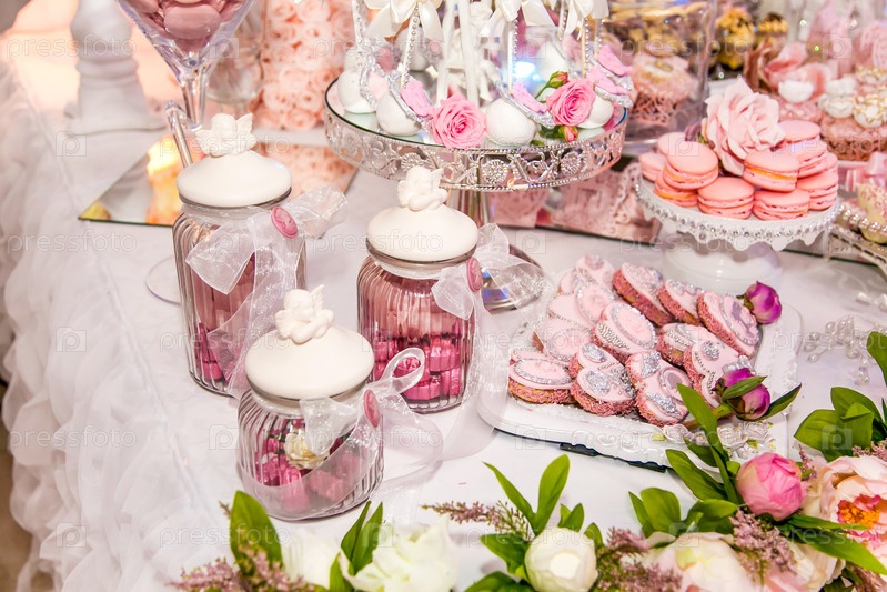 Вкусные десерты в свадебном кондитерском баре в буфетной зоне: печенье, покрытое глазурой, украшенное ангелами, камео, сахарными розами и серебряным красителем