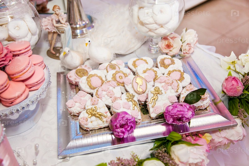 Вкусные десерты на свадебном конфет-баре в буфете: печенье, покрытое льдом, украшенное ангелами, камео, сахарными розами и золотым красителем