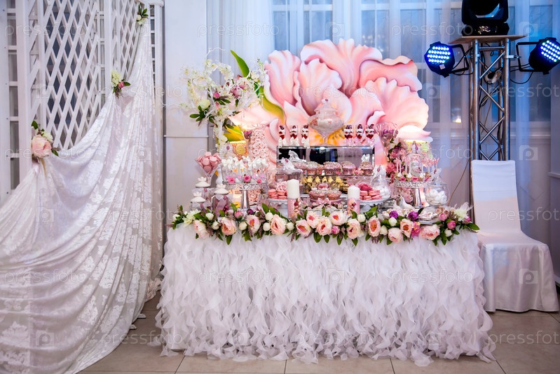 Вкусные десерты в свадебном конфет-баре в зоне буфета: украшенные свечи, розы, ленточки, макароны, клубники в белом шоколаде