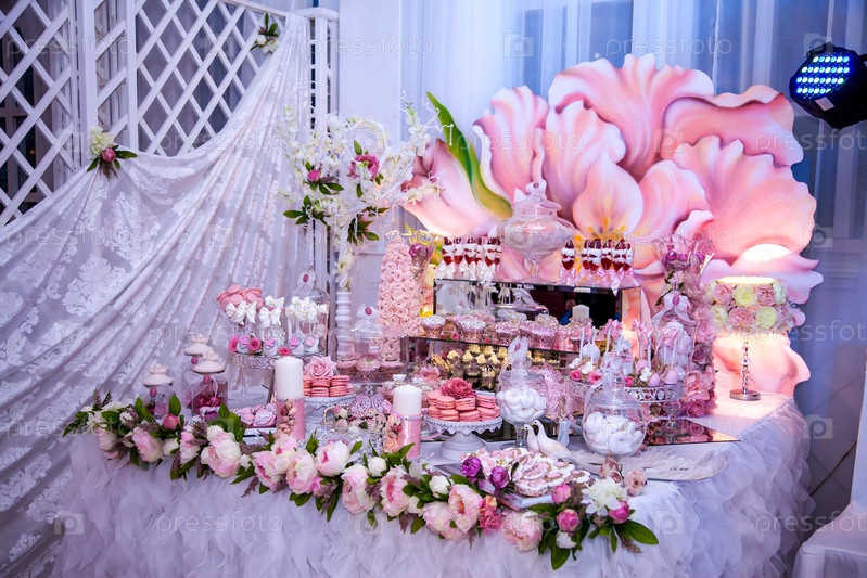 Вкусные десерты в свадебном конфет-баре в зоне буфета: украшенные свечи, розы, ленточки, макароны, клубники в белом шоколаде