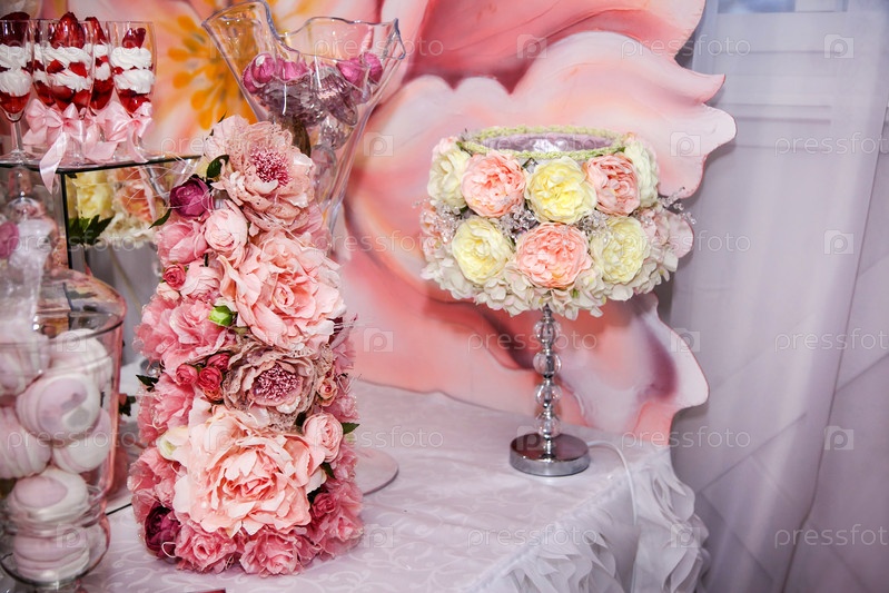 Лампа с оттенком искусственных цветов на десертном столе на свадебном банкете