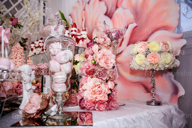 Лампа с оттенком искусственных цветов на десертном столе на свадебном банкете