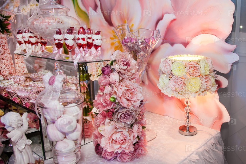 Лампа с оттенком искусственных цветов на десертном столе на свадебном банкете