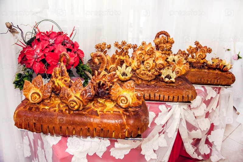 Кондитерские торты, набитые дрожжевым тестом, украшенные фигурами и цветами из теста - искусство хлеба, орнаментированный свадебный хлеб