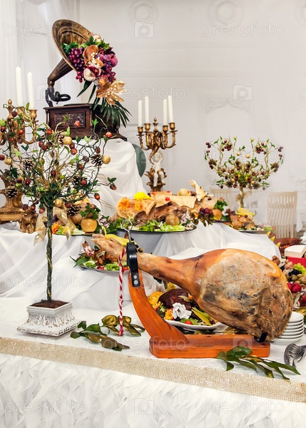 Буфетный стол с мясными закусками, сухой свининой ножкой, выпечёнными свиньями в фруктовом тесте, украшенным люстрами и граммофоном