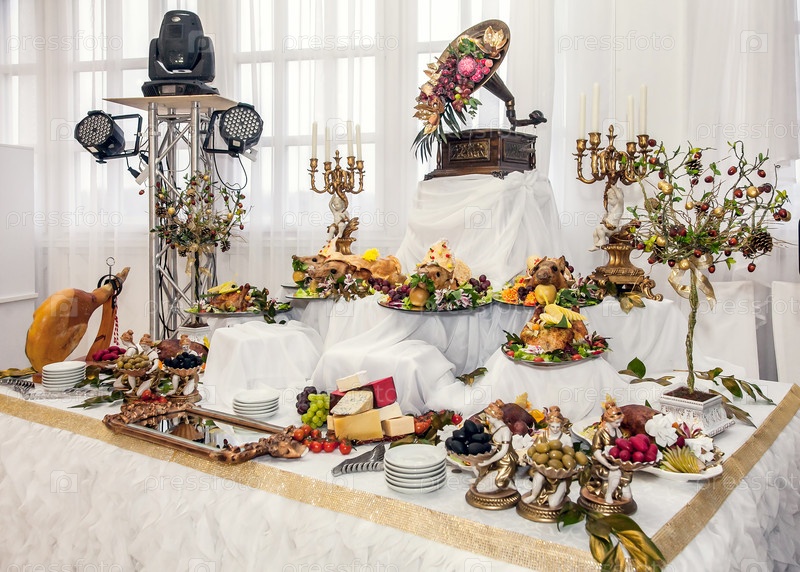 Буфетный стол с мясными закусками, выпечённой свиньей в тесте, сыром, индейкой с фруктами, украшенные люстрами и граммофоном
