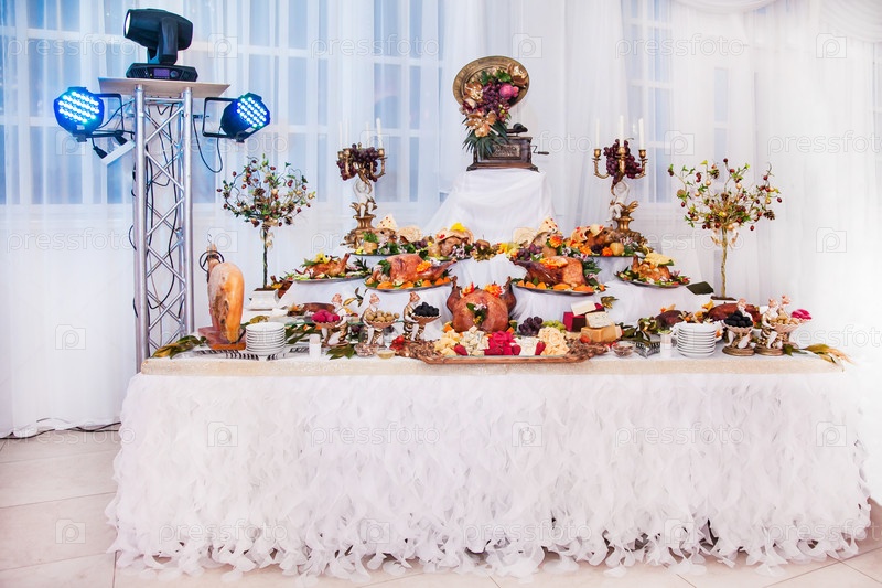 Буфетный стол с мясными закусками, выпечённой свиньей в тесте, сыром, индейкой с фруктами, украшенные люстрами и граммофоном