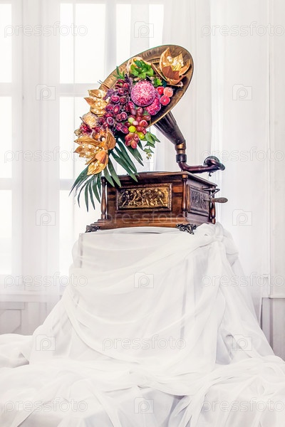 Ретро граммофон с горячим динамиком, украшенный фруктами на пьедестале, покрытом белой chiffon тканью
