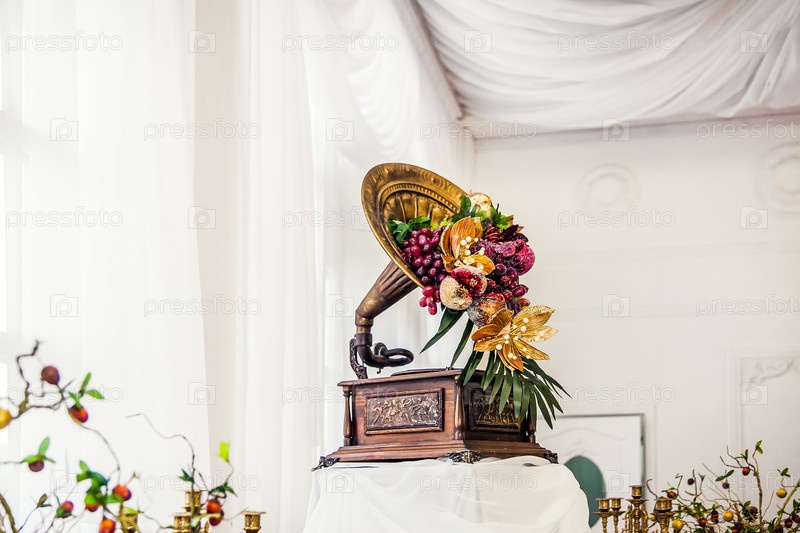 Ретро граммофон, украшенный фруктами на свадебном банкете, украшает стол для буфета