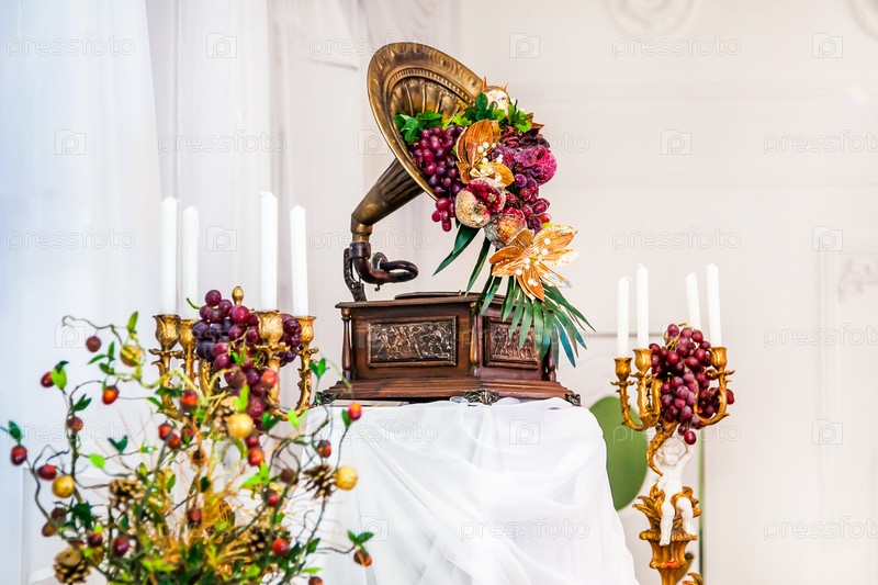 Ретро граммофон, украшенный фруктами на свадебном банкете, украшает стол для буфета