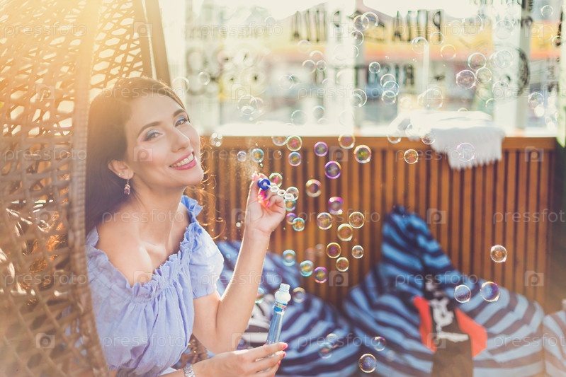 Молодая женщина с ярким макияжем сидит в летнем открытом кафе на висячем кресле и выдувает мыльные пузыри