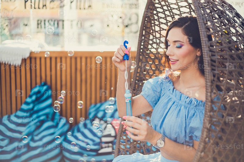 Молодая женщина с ярким макияжем сидит в летнем открытом кафе на висячем кресле и выдувает мыльные пузыри