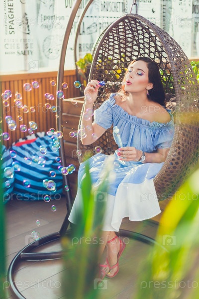 Молодая женщина с ярким макияжем сидит в летнем открытом кафе на висячем кресле и выдувает мыльные пузыри