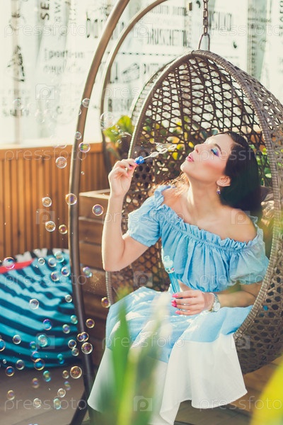 Молодая женщина с ярким макияжем сидит в летнем открытом кафе на висячем кресле и выдувает мыльные пузыри