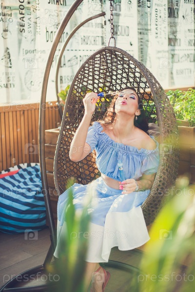 Молодая женщина с ярким макияжем сидит в летнем открытом кафе на висячем кресле и выдувает мыльные пузыри