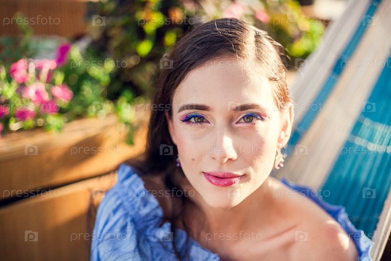Красивая молодая женщина с ярким макияжем и темными волосами сидит в гамаке на летней террасе городского кафе, смотрит в камеру и улыбается