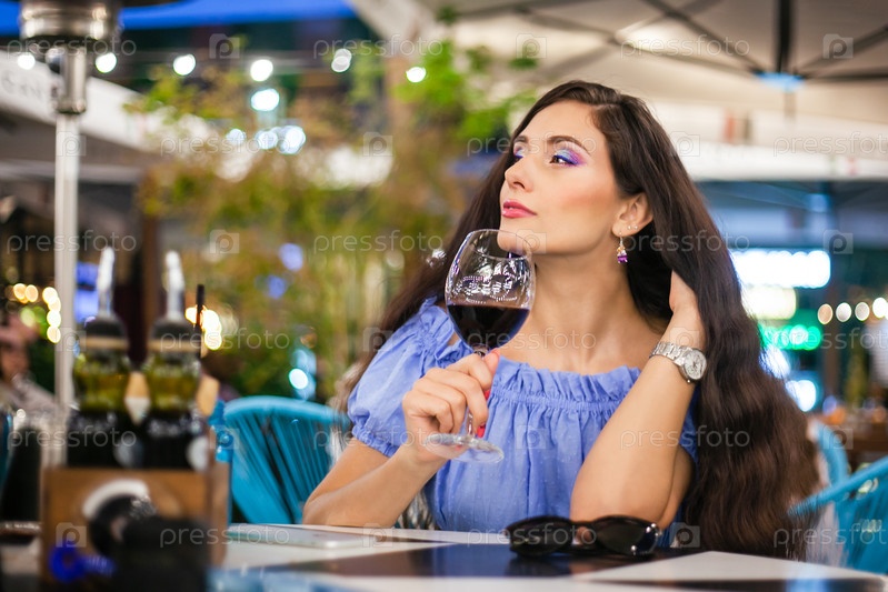 Молодая женщина с ярким макияжем пьет вино из бокала в уличном кафе, смотрит издалека со слабой улыбкой