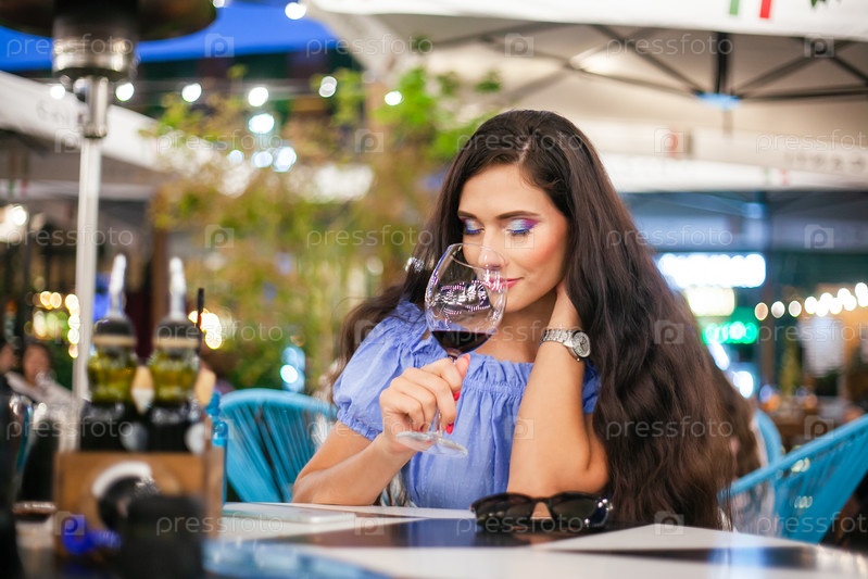 Молодая женщина с ярким макияжем вдыхает аромат вина из бокала в уличном кафе
