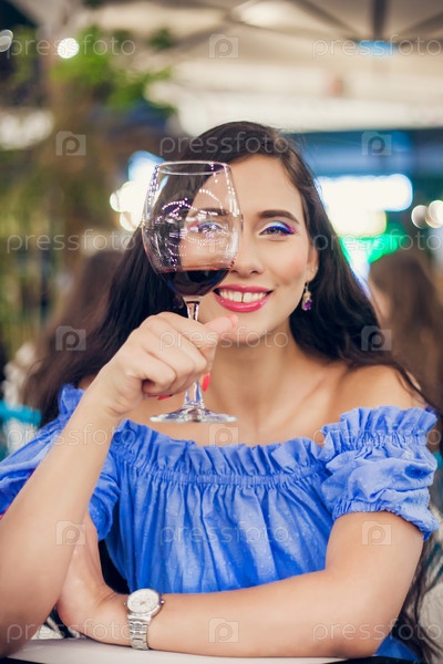 Молодая женщина с ярким макияжем смотрит через бокал вина в уличном кафе