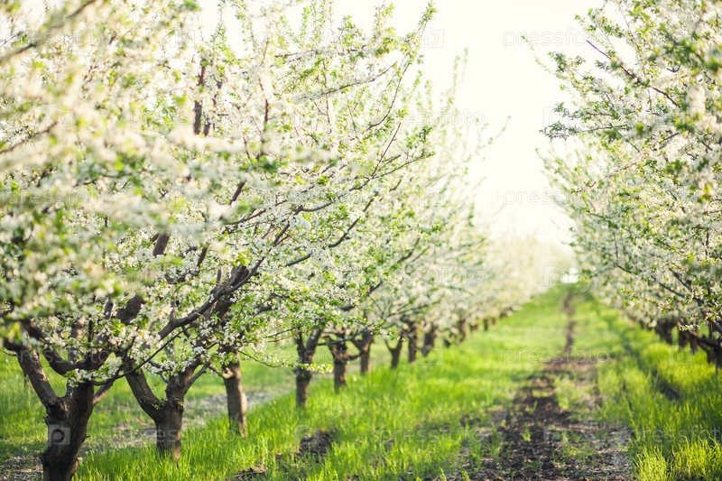 Путешествие в цветущий весенний сад.Белые яблочные цветки в саду.Весенний фон