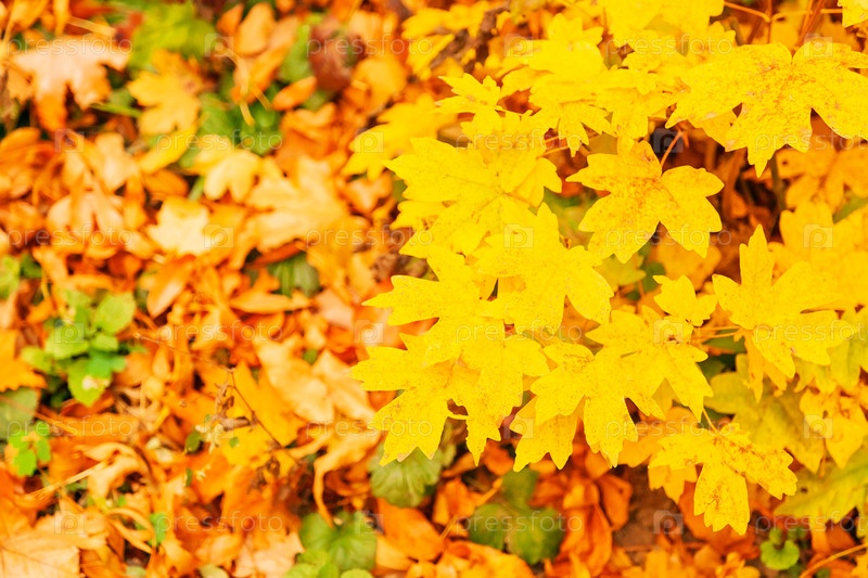На фоне осенних желтых и оранжевых сухих листьев, лежащих на земле