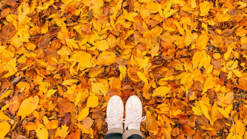Осенние желтые и оранжевые сухие листья лежат на земле с белыми женскими кроссовками