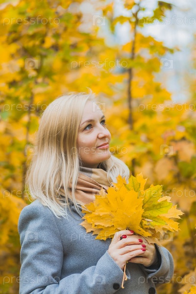 Женщина держит желтые листья клена в парке среди деревьев