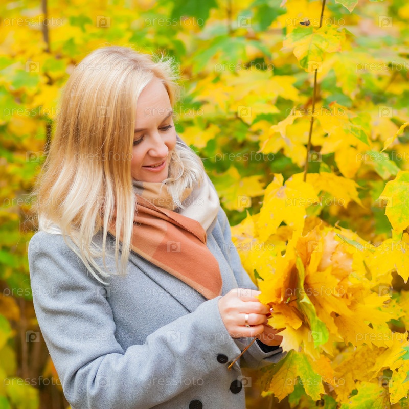 Женщина любит собирать ярко-желтые листья осенью в красивом парке