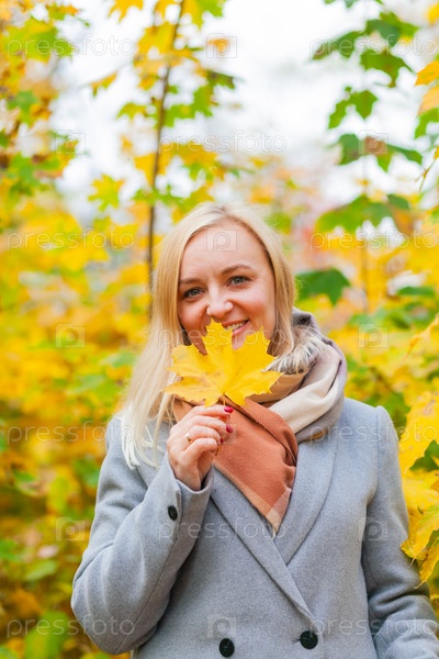 Женщина держит желтый лист, окруженный осенними листьями в красочном парке