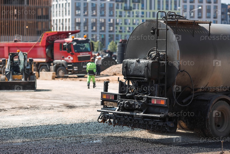 Тяжелое оборудование для земляных работ и улучшения. Закрытие битумного танкера. Подготовка к прокладке асфальта. Строительство дорог