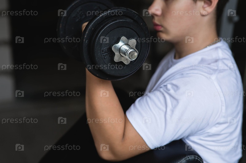 На снимке молодой человек, занимающийся упражнениями руками с помощью гантели. Строительство мышц. Спорт и здоровый образ жизни