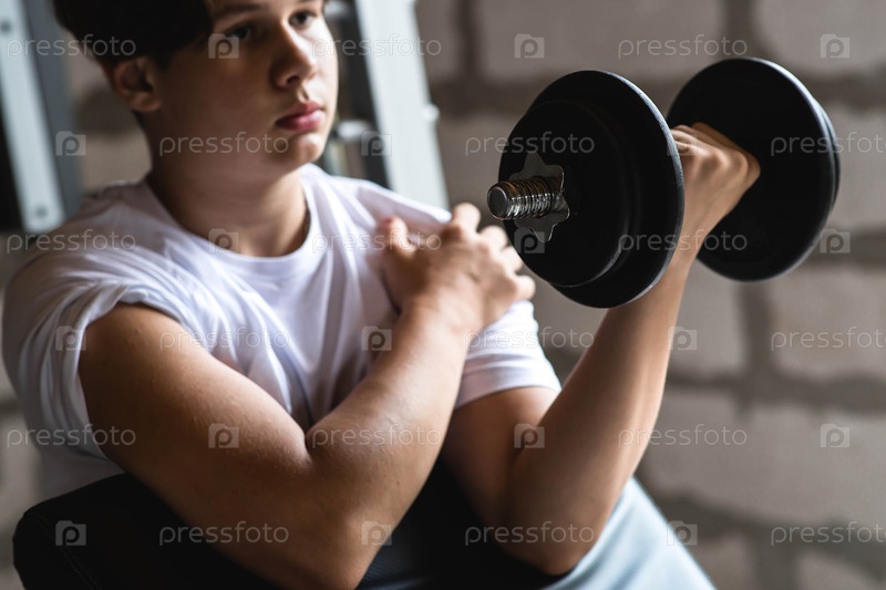 На снимке молодой человек, занимающийся упражнениями руками с помощью гантели. Строительство мышц. Спорт и здоровый образ жизни