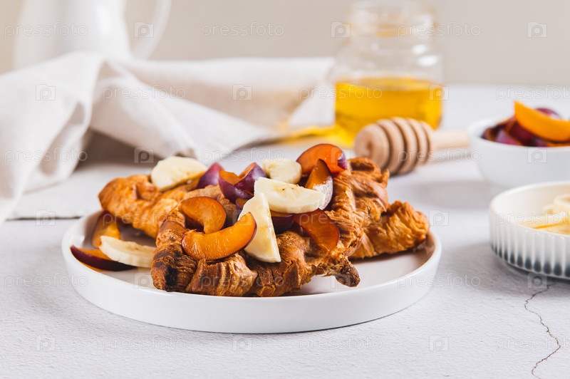Милые детские коляски с бананом, сливой и медом на тарелке на столе