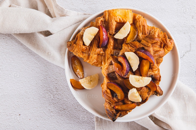 Покройте сладкие крошки бананом, сливой и медом на тарелке на столе сверху