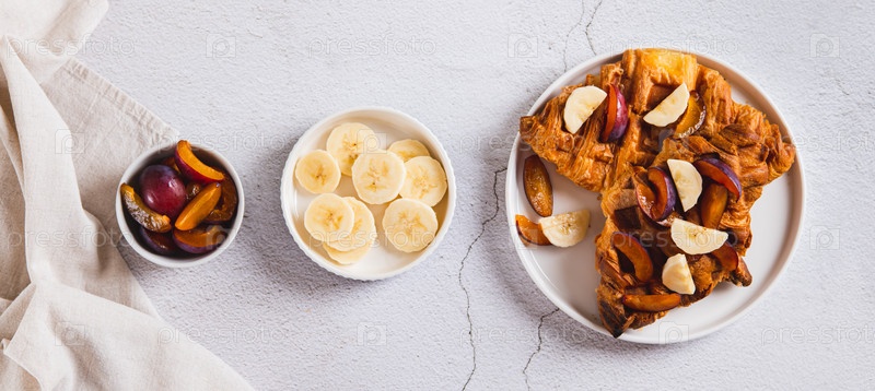 Вафли с фруктами и медом на тарелке на веб-баннере, выходящем за стол