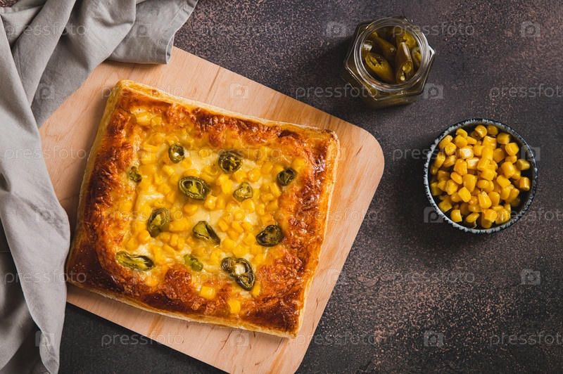 Пикантная пицца с перцем джалапено, кукурузой и сыром на деревянной доске