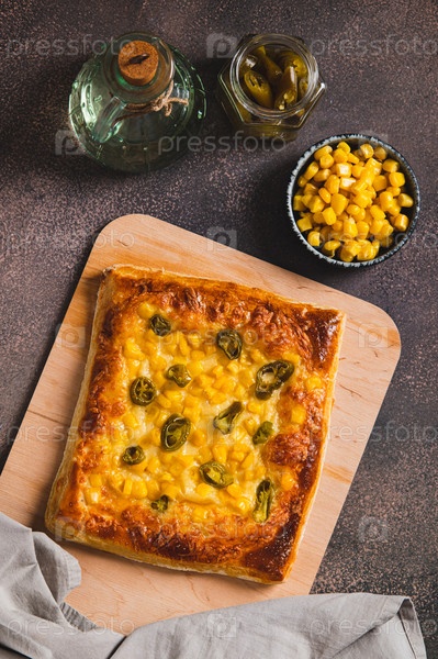 Традиционная мексиканская пицца с халапено, сыром и кукурузой на доске наверху и с вертикальным видом