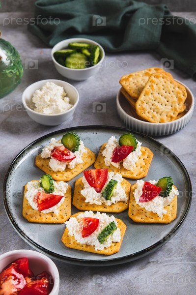 Мягкий сыр и овощи на крекерах на тарелке на столе, вертикальный вид