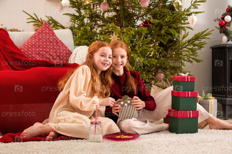 Две счастливые девушки с рыжими волосами сидят на полу возле рождественской елки.Девушка держит подарочную коробку.Дети празднуют дома