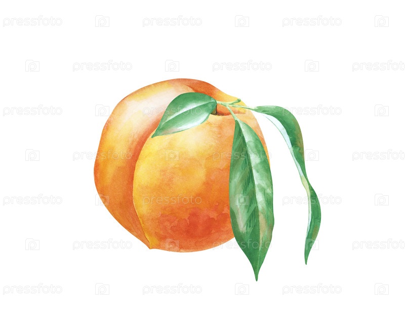 Сочный круглый персик с зелеными листьями, написанный вручную. Иллюстрация акварели выделена на белом фоне. Ботанический рисунок спелых фруктов для меню, садоводства, приготовления пищи, скарапбукинга