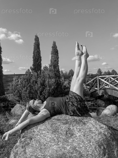 51-летний спортсмен позирует на камне в поместье