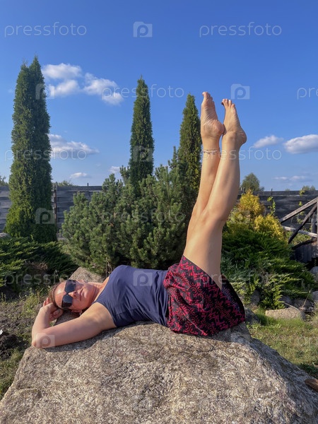 51-летний спортсмен позирует на камне в поместье