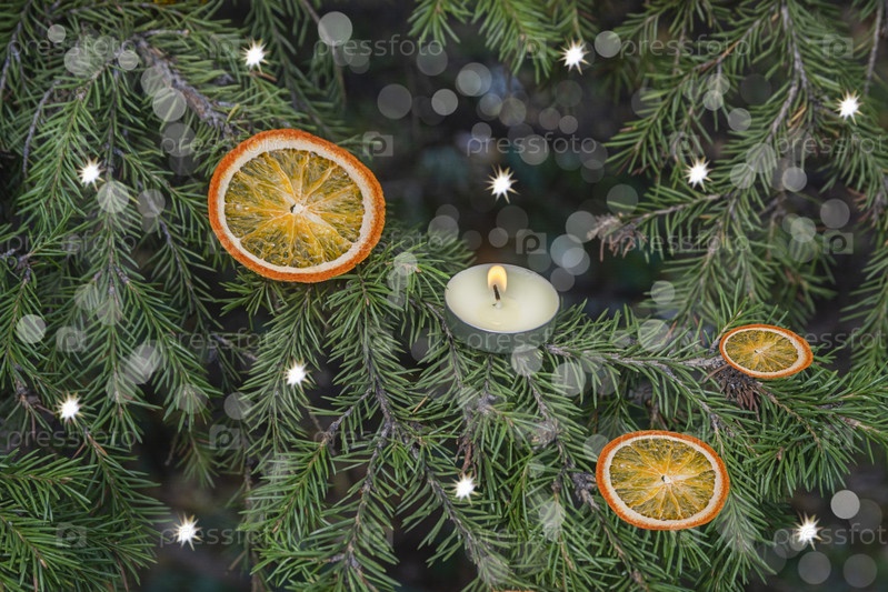Сушеные нарезы апельсина, свеча и блеск украшают рождественскую елку в лесу. Фрагмент украшенной Рождественской елки. Концепция Нового года и Рождества