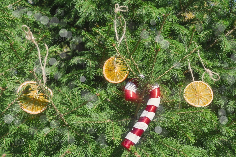 Сушеные кусочки апельсина и тростниковый орнамент украшают рождественскую елку в лесу. Фрагмент декорированной рождественской ёлки. Новый год и Рождественская концепция