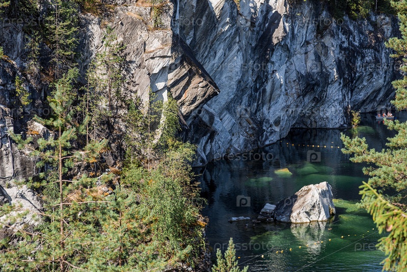 Летний пейзаж горного парка Рускеала. Бирюзовый и мраморный каньон летом. Россия, Республика Карелия, деревня Рускеала
