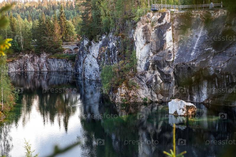 Летний пейзаж горного парка Рускеала. Бирюзовый и мраморный каньон летом. Россия, Республика Карелия, деревня Рускеала