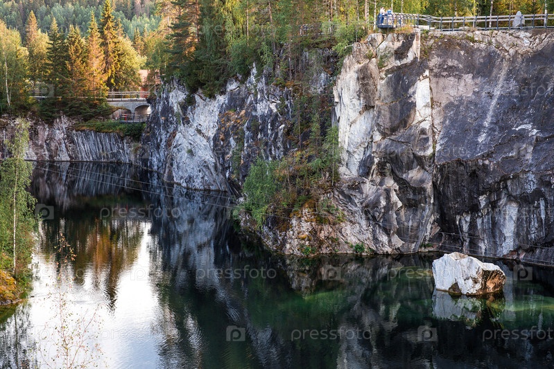 Летний пейзаж горного парка Рускеала. Бирюзовый и мраморный каньон летом. Россия, Республика Карелия, деревня Рускеала