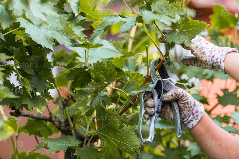 Осенние садовые работы.Рука огородника с обрезанными ножницами.Обрезание виноградной лозы со срезанными ножницами.Сады и сады, садоводство, уход за растениями