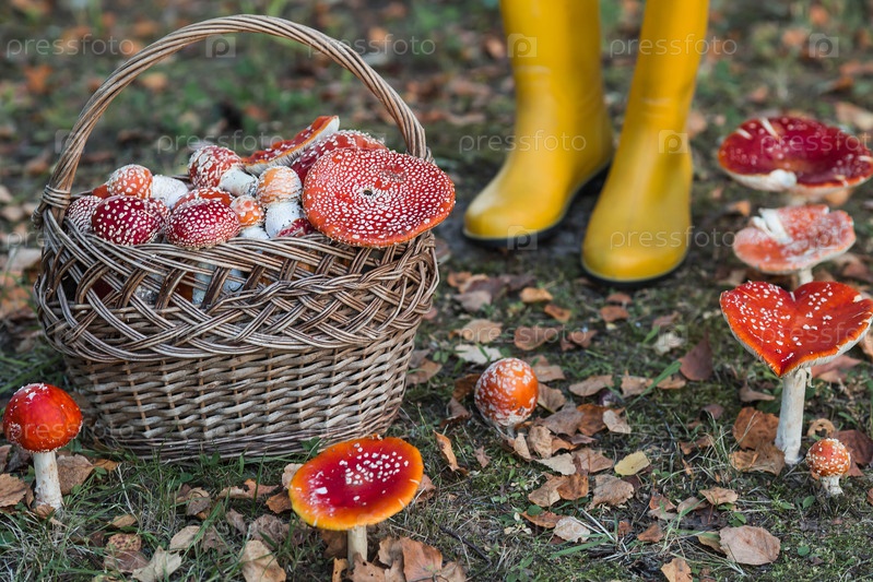 Ядовитые красные дикие грибы в плетеновой корзине и грибные ножки в желтых сапогах. Подборка лягушек. Микродоза отравления ядом или грибами